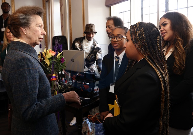 WELLINGBOROUGH, ENGLAND - FEBRUARY 16: Princess Anne, Princess Royal talks to school children during her visit to knife crime community group Off The Streets, on February 16, 2024 in Wellingborough, England. Off the Streets NN was started in 2021 after the tragic death of 16-year-old Dylan Holliday, due to knife crime., Credit:Darren Staples / Avalon