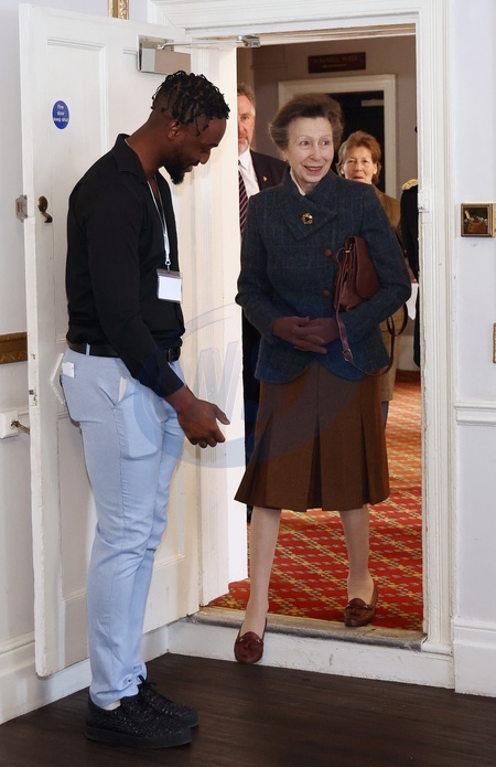 WELLINGBOROUGH, ENGLAND - FEBRUARY 16: Princess Anne, Princess Royal is welcomed by Ravaun Jones, Director and Co-Founder during a visit to knife crime community group 'Off The Streets' on February 16, 2024 in Wellingborough, England. Off the Streets NN was started in 2021 after the tragic death of 16-year-old Dylan Holliday, due to knife crime., Credit:Darren Staples / Avalon