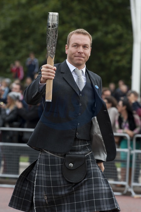 The Queen accompanied by The Duke of Edinburgh, launches The Queen's Baton Relay from the forecourt of Buckingham Palace.Sir Chris Hoy carried the XX Glasgow Commonwealth Games baton, as it starts its journey around the member states of Commonwealth, Credit:Gary Lee / Avalon