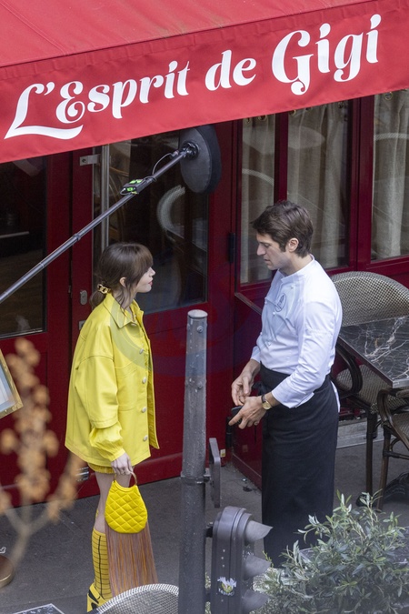 CM - Lily Collins et Lucas Bravo sur le tournage de la saison 4 de série Netflix "Emily in Paris" devant le restaurant L'Esprit de Gigi à Paris