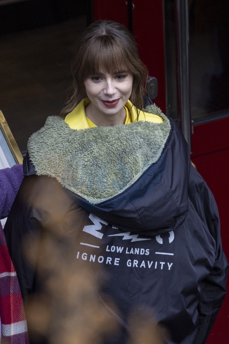 Lily Collins sur le tournage de la saison 4 de série Netflix "Emily in Paris" devant le restaurant L'Esprit de Gigi à Paris, France, le 16 février 2024. Lily Collins on the set of season 4 of Netflix series "Emily in Paris" in front of the L'Esprit de Gigi restaurant in Paris, France, on February 16, 2024.