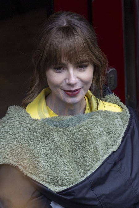 Lily Collins sur le tournage de la saison 4 de série Netflix "Emily in Paris" devant le restaurant L'Esprit de Gigi à Paris, France, le 16 février 2024. Lily Collins on the set of season 4 of Netflix series "Emily in Paris" in front of the L'Esprit de Gigi restaurant in Paris, France, on February 16, 2024.