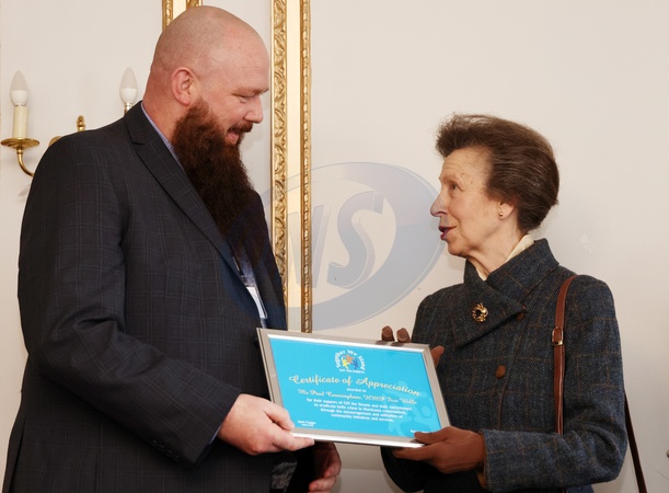 WELLINGBOROUGH, ENGLAND - FEBRUARY 16: Princess Anne, Princess Royal presents Paul Cunningham from HMP Five Well with a certificate during her visit to knife crime community group Off The Streets on February 16, 2024 in Wellingborough, England. Off the Streets NN was started in 2021 after the tragic death of 16-year-old Dylan Holliday, due to knife crime., Credit:Darren Staples / Avalon