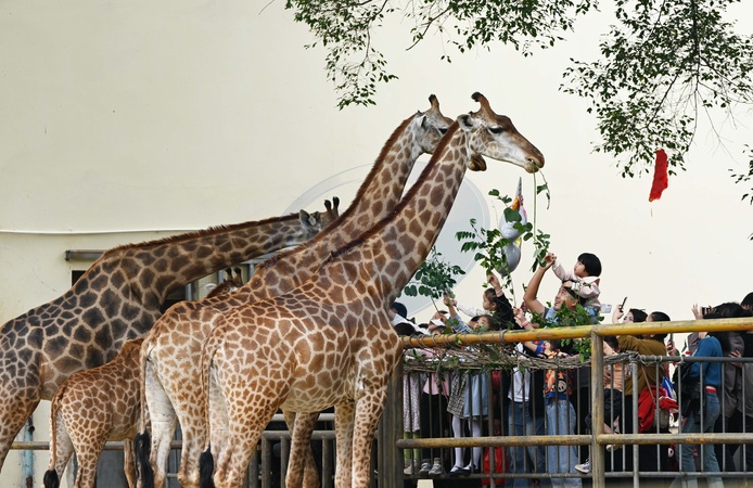 Tourists feed giraffes in a zoo in Nanning city in south China's Guangxi Zhuang Autonomous Region Wednesday, Feb. 14, 2024., Credit:HU YAN / Avalon