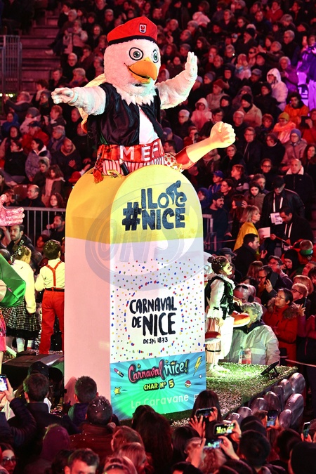 Le char La Caravane durant le premier corso carnavalesque illuminé du Carnaval de Nice 2024 "Roi de la Pop Culture", le 17 février 2024. C'est les 151 ans du Carnaval et la 139eme édition. L'événement se déroule du 17 février au 3 mars. Le Carnaval de Nice est le 1er carnaval de France et l'un des plus célèbres du monde, avec ceux de Rio et de Venise, attirant chaque année des centaines de milliers de spectateurs. © Bruno Bebert/Bestimage 151th edition of the Nice Carnival in the French Riviera City, France, on February 17, 2024. The Carnival takes place until March 02, 2024 on the theme "King of pop culture".