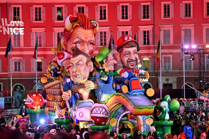 Le char Les Fous du Volant, où l'on retrouve Emmanuel Macron, Volodymyr Zelensky ou encore Poutine durant le premier corso carnavalesque illuminé du Carnaval de Nice 2024 "Roi de la Pop Culture", le 17 février 2024. C'est les 151 ans du Carnaval et la 139eme édition. L'événement se déroule du 17 février au 3 mars. Le Carnaval de Nice est le 1er carnaval de France et l'un des plus célèbres du monde, avec ceux de Rio et de Venise, attirant chaque année des centaines de milliers de spectateurs. © Bruno Bebert/Bestimage 151th edition of the Nice Carnival in the French Riviera City, France, on February 17, 2024. The Carnival takes place until March 02, 2024 on the theme "King of pop culture".