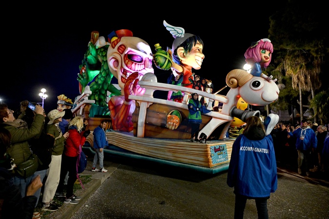 Le char BD à l'abordage, imaginé par Cyprien, de son nom complet Cyprien Iov, né à Nice, vidéaste web, blogueur, acteur, scénariste de films et de bandes dessinées, qui a dessiné un char cette année, durant le premier corso carnavalesque illuminé du Carnaval de Nice 2024 "Roi de la Pop Culture", le 17 février 2024. C'est les 151 ans du Carnaval et la 139eme édition. L'événement se déroule du 17 février au 3 mars. Le Carnaval de Nice est le 1er carnaval de France et l'un des plus célèbres du monde, avec ceux de Rio et de Venise, attirant chaque année des centaines de milliers de spectateurs. © Bruno Bebert/Bestimage 151th edition of the Nice Carnival in the French Riviera City, France, on February 17, 2024. The Carnival takes place until March 02, 2024 on the theme "King of pop culture".