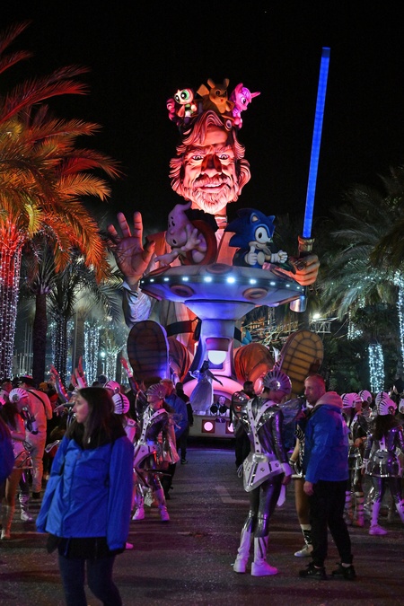 Premier corso carnavalesque illuminé du Carnaval de Nice 2024 "Roi de la Pop Culture"