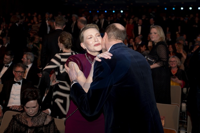 The Prince of Wales, president of Bafta, greets Cate Blanchett at the Bafta Film Awards 2024, at the Royal Festival Hall, Southbank Centre, London., Credit:Jordan Pettitt / Avalon
