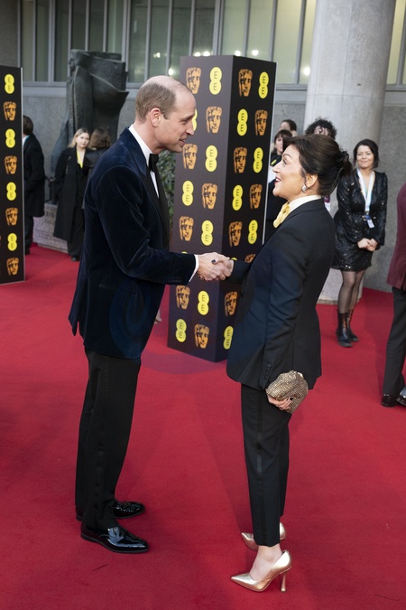 The Prince of Wales, president of Bafta, greets Jane Millichip, CEO of Bafta as he attends the Bafta Film Awards 2024, at the Royal Festival Hall, Southbank Centre, London., Credit:Jordan Pettitt / Avalon