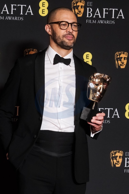 Cord Jefferson poses backstage at the 2024 EE BAFTA Film Awards on Sunday 18 February 2024 at Royal Festival Hall, London. Pictured backstage with the BAFTA award for Adapted Screenplay., Credit:Julie Edwards / Avalon
