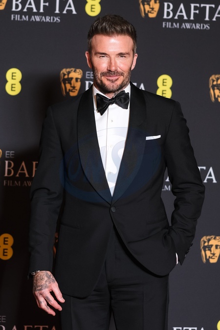 David Beckham poses backstage at the 2024 EE BAFTA Film Awards on Sunday 18 February 2024 at Royal Festival Hall, London. Pictured backstage with the BAFTA award for Outstanding British Contribution to Cinema., Credit:Julie Edwards / Avalon