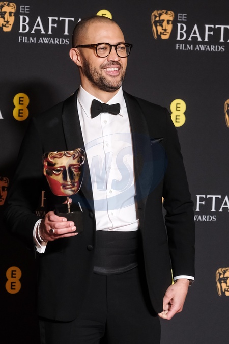 Cord Jefferson poses backstage at the 2024 EE BAFTA Film Awards on Sunday 18 February 2024 at Royal Festival Hall, London. Pictured backstage with the BAFTA award for Adapted Screenplay., Credit:Julie Edwards / Avalon