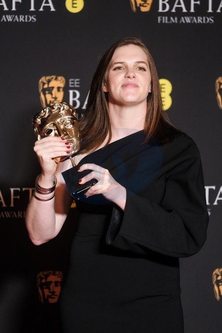 Jennifer Lame poses backstage at the 2024 EE BAFTA Film Awards on Sunday 18 February 2024 at Royal Festival Hall, London. Pictured backstage with the BAFTA award for Editing., Credit:Julie Edwards / Avalon