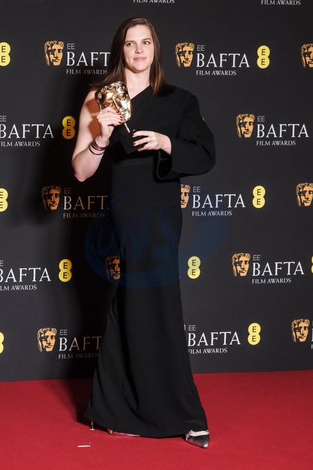 Jennifer Lame poses backstage at the 2024 EE BAFTA Film Awards on Sunday 18 February 2024 at Royal Festival Hall, London. Pictured backstage with the BAFTA award for Editing., Credit:Julie Edwards / Avalon