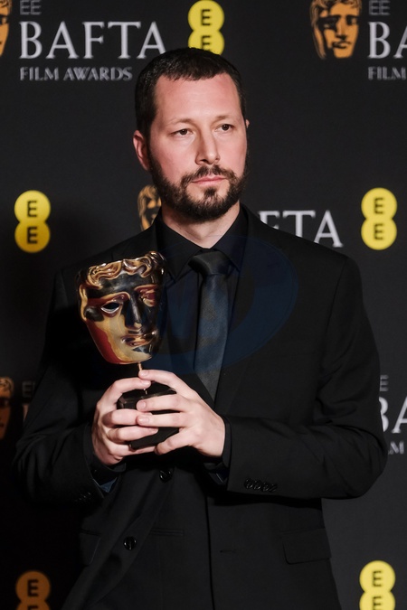 Mstyslav Chernov poses backstage at the 2024 EE BAFTA Film Awards on Sunday 18 February 2024 at Royal Festival Hall, London. Pictured backstage with the BAFTA award for Documentary., Credit:Julie Edwards / Avalon