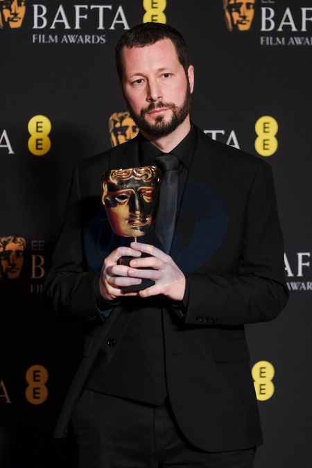 Mstyslav Chernov poses backstage at the 2024 EE BAFTA Film Awards on Sunday 18 February 2024 at Royal Festival Hall, London. Pictured backstage with the BAFTA award for Documentary., Credit:Julie Edwards / Avalon