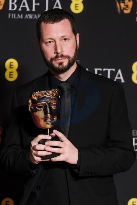 Mstyslav Chernov poses backstage at the 2024 EE BAFTA Film Awards on Sunday 18 February 2024 at Royal Festival Hall, London. Pictured backstage with the BAFTA award for Documentary., Credit:Julie Edwards / Avalon