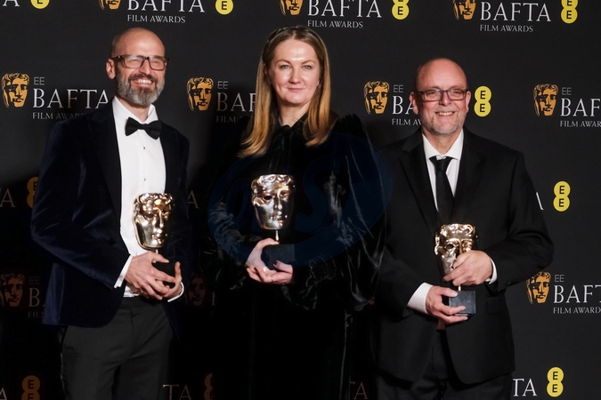 Nadia Stacey, Mark Coulier, Josh Weston poses backstage at the 2024 EE BAFTA Film Awards on Sunday 18 February 2024 at Royal Festival Hall, London. Pictured backstage Bafta Fellowship., Credit:Julie Edwards / Avalon
