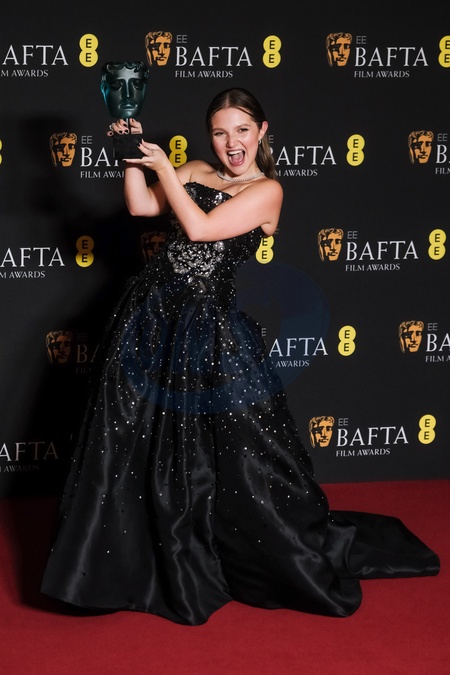 Mia Mckenna-Bruce poses backstage at the 2024 EE BAFTA Film Awards on Sunday 18 February 2024 at Royal Festival Hall, London. Pictured backstage with the BAFTA EE Rising Star Award., Credit:Julie Edwards / Avalon