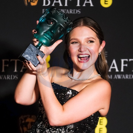 Mia Mckenna-Bruce poses backstage at the 2024 EE BAFTA Film Awards on Sunday 18 February 2024 at Royal Festival Hall, London. Pictured backstage with the BAFTA EE Rising Star Award., Credit:Julie Edwards / Avalon