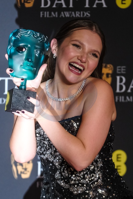 Mia Mckenna-Bruce poses backstage at the 2024 EE BAFTA Film Awards on Sunday 18 February 2024 at Royal Festival Hall, London. Pictured backstage with the BAFTA EE Rising Star Award., Credit:Julie Edwards / Avalon