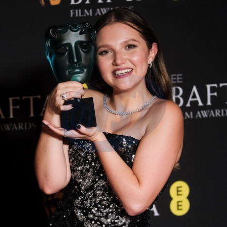 Mia Mckenna-Bruce poses backstage at the 2024 EE BAFTA Film Awards on Sunday 18 February 2024 at Royal Festival Hall, London. Pictured backstage with the BAFTA EE Rising Star Award., Credit:Julie Edwards / Avalon