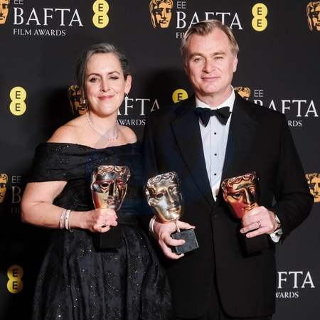 Christopher Nolan and Emma Thomas poses backstage at the 2024 EE BAFTA Film Awards on Sunday 18 February 2024 at Royal Festival Hall, London. Pictured backstage with the BAFTA award for Best Film and the BAFTA award for Best Director., Credit:Julie Edwards / Avalon