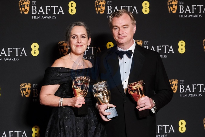 Christopher Nolan and Emma Thomas poses backstage at the 2024 EE BAFTA Film Awards on Sunday 18 February 2024 at Royal Festival Hall, London. Pictured backstage with the BAFTA award for Best Film and the BAFTA award for Best Director., Credit:Julie Edwards / Avalon
