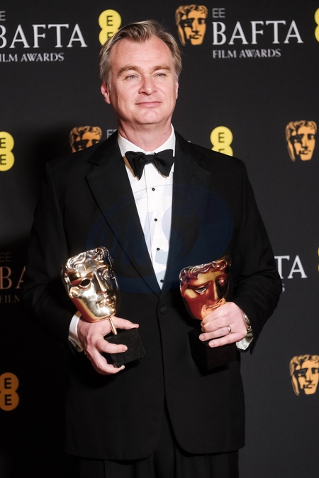 Christopher Nolan poses backstage at the 2024 EE BAFTA Film Awards on Sunday 18 February 2024 at Royal Festival Hall, London. Pictured backstage with the BAFTA award for Best Director., Credit:Julie Edwards / Avalon