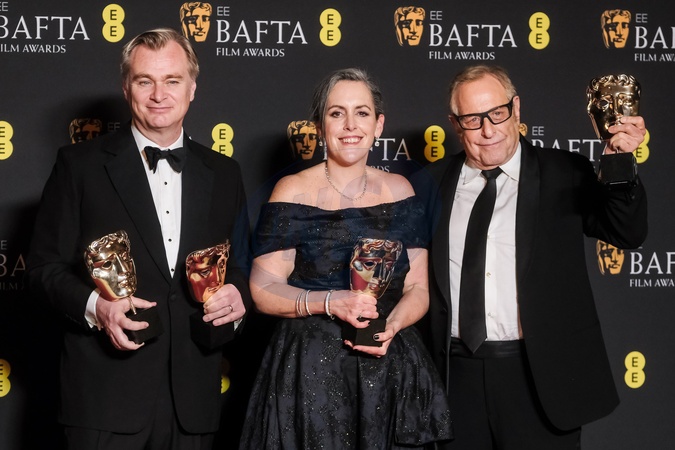 Christopher Nolan, Emma Thomas and Charles Roven poses backstage at the 2024 EE BAFTA Film Awards on Sunday 18 February 2024 at Royal Festival Hall, London. Pictured backstage with the BAFTA award for Best Director., Credit:Julie Edwards / Avalon