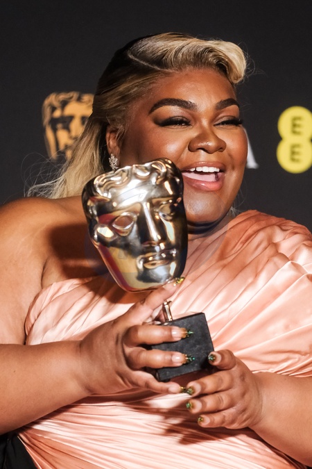 Da'vine Joy Randolph poses backstage at the 2024 EE BAFTA Film Awards on Sunday 18 February 2024 at Royal Festival Hall, London. Pictured backstage with the BAFTA award for Supporting Actress., Credit:Julie Edwards / Avalon