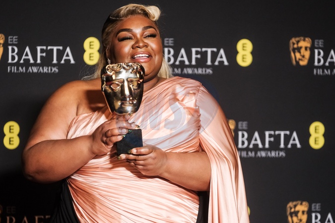 Da'vine Joy Randolph poses backstage at the 2024 EE BAFTA Film Awards on Sunday 18 February 2024 at Royal Festival Hall, London. Pictured backstage with the BAFTA award for Supporting Actress., Credit:Julie Edwards / Avalon