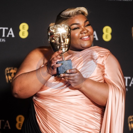 Da'vine Joy Randolph poses backstage at the 2024 EE BAFTA Film Awards on Sunday 18 February 2024 at Royal Festival Hall, London. Pictured backstage with the BAFTA award for Supporting Actress., Credit:Julie Edwards / Avalon