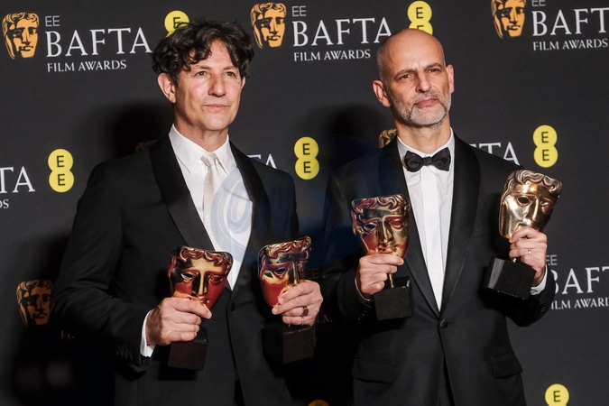 Jonathan Glazer and James Wilson poses backstage at the 2024 EE BAFTA Film Awards on Sunday 18 February 2024 at Royal Festival Hall, London. Pictured backstage with the BAFTA award for Film Not in the English Language., Credit:Julie Edwards / Avalon