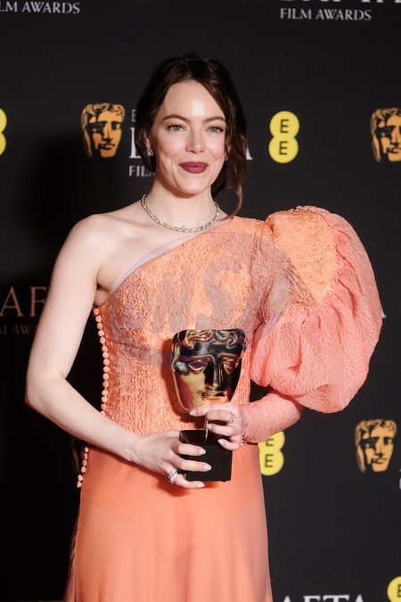 Emma Stone poses backstage at the 2024 EE BAFTA Film Awards on Sunday 18 February 2024 at Royal Festival Hall, London. Pictured backstage with the BAFTA award for Leading Actress., Credit:Julie Edwards / Avalon