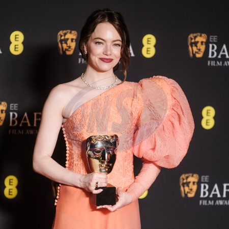 Emma Stone poses backstage at the 2024 EE BAFTA Film Awards on Sunday 18 February 2024 at Royal Festival Hall, London. Pictured backstage with the BAFTA award for Leading Actress., Credit:Julie Edwards / Avalon