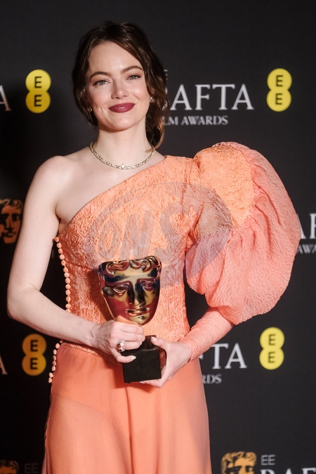 Emma Stone poses backstage at the 2024 EE BAFTA Film Awards on Sunday 18 February 2024 at Royal Festival Hall, London. Pictured backstage with the BAFTA award for Leading Actress., Credit:Julie Edwards / Avalon