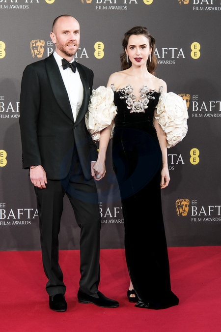 Charlie McDowell and Lily Collins arriving at the 2024 EE BAFTA Film Awards on Sunday 18 February 2024 at Royal Festival Hall, London. ., Credit:Julie Edwards / Avalon