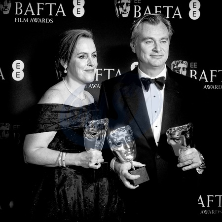 Christopher Nolan and Emma Thomas poses backstage at the 2024 EE BAFTA Film Awards on Sunday 18 February 2024 at Royal Festival Hall, London. Pictured backstage with the BAFTA award for Best Film and the BAFTA award for Best Director., Credit:Julie Edwards / Avalon