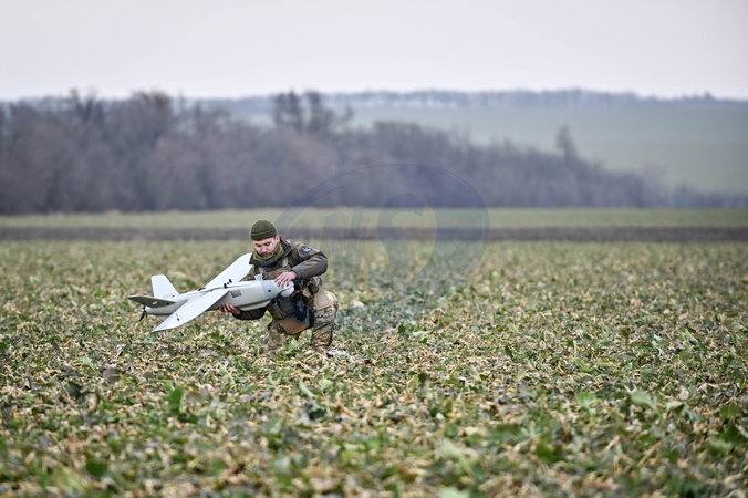 UKRAINE - FEBRUARY 15, 2024 - A serviceman of an aerial reconnaissance platoon of the 108th Independent Brigade of the Ukrainian Territorial Defence Forces which defends Ukraine against the Russian aggressor on the Zaporizhzhia axis, picks up a Leleka-100 UAV, Ukraine., Credit:Dmytro Smolienko / Avalon