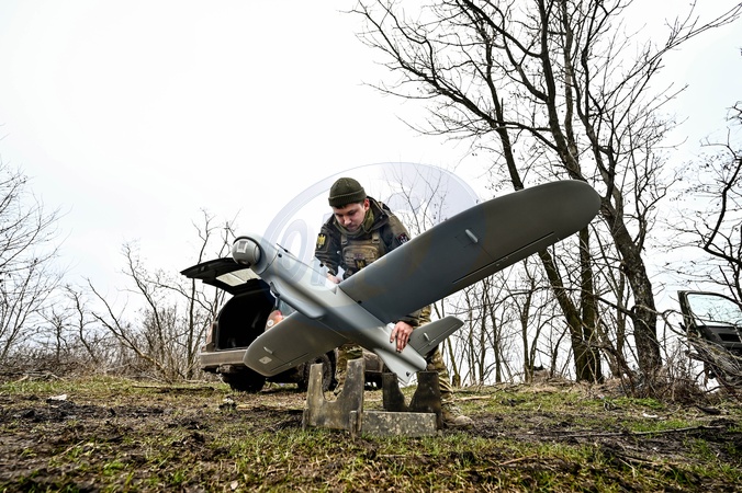 UKRAINE - FEBRUARY 15, 2024 - A serviceman of an aerial reconnaissance platoon of the 108th Independent Brigade of the Ukrainian Territorial Defence Forces which defends Ukraine against the Russian aggressor on the Zaporizhzhia axis, gets a Leleka-100 UAV ready for the launch, Ukraine., Credit:Dmytro Smolienko / Avalon