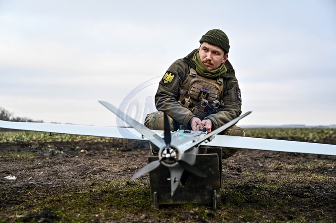 UKRAINE - FEBRUARY 15, 2024 - A serviceman of an aerial reconnaissance platoon of the 108th Independent Brigade of the Ukrainian Territorial Defence Forces which defends Ukraine against the Russian aggressor on the Zaporizhzhia axis, gets a Leleka-100 UAV ready for the launch, Ukraine., Credit:Dmytro Smolienko / Avalon