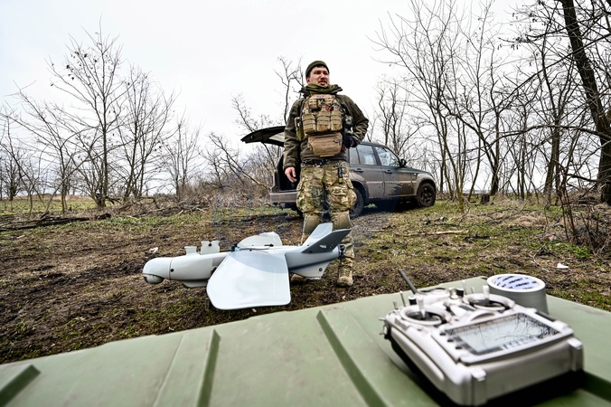 UKRAINE - FEBRUARY 15, 2024 - A serviceman of an aerial reconnaissance platoon of the 108th Independent Brigade of the Ukrainian Territorial Defence Forces which defends Ukraine against the Russian aggressor on the Zaporizhzhia axis, gets a Leleka-100 UAV ready for the launch, Ukraine., Credit:Dmytro Smolienko / Avalon