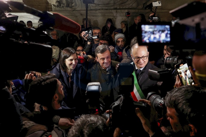 Elly Schlein, Carlo Calenda, Roberto Gualtieri during the torchlight procession in memory of Russian opposition leader Alexei Navalny, who died on 16 February in a Arctic penal colony, the Federal Penitentiary Service of the Yamalo-Nenets Autonomous District, in Capitol Square, Rome, Italy, 19 February 2024., Credit:Riccardo De Luca / Avalon