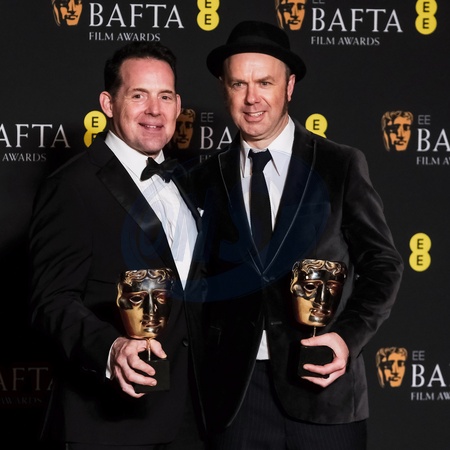 Johnnie Burn, Tarn Willers poses backstage at the 2024 EE BAFTA Film Awards on Sunday 18 February 2024 at Royal Festival Hall, London. Pictured backstage with the BAFTA award for Sound., Credit:Julie Edwards / Avalon