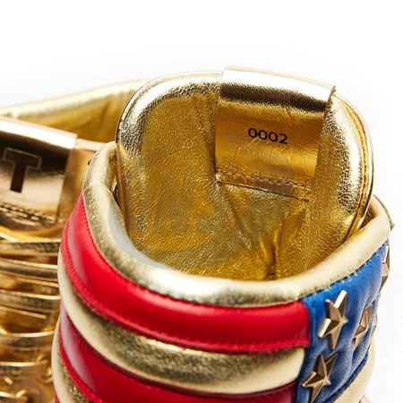 Pictures must credit: 45Footwear LLC Former US president Donald Trump has launched a golden trainer collection designed for "true Patriots” And the footwear by maker 45Footwear has already reportedly sold out. Just 1,000 numbered pairs of the Never Surrender High-Tops were released, with "at least 10" autographed by Trump. The trainers, which retail for $399USD / €370 euros on a merchandise website, are covered in a gold finish and feature a T sign on their tongue and their sides. A Stars and Stripes US flag is wrapped around the tops which have a red and white sole and are described as "bold, gold and tough.” The trainers were launched on February 17 on a website called Trump Sneakers and sale was restricted to three pairs per customers. Picture supplied by JLPPA © JLPPA/Bestimage