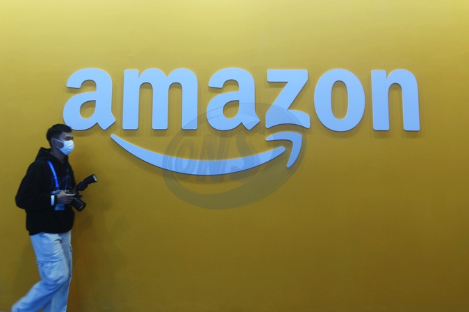A photographer walks by the sign of the U.S. company Amazon during a tech fair in Hangzhou in east China's Zhejiang province Thursday, Nov. 23, 2023., Credit:LONG WEI / Avalon