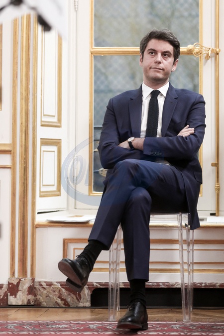 Le Premier ministre Gabriel Attal donne une conference de presse sur la situation agricole, à l'Hôtel de Matignon à Paris, France, le 21 février 2024. © Stéphane Lemouton/Bestimage French Prime Minister Gabriel Attal during a press conference at the Hotel Matignon, in Paris, on February 21, 2024 to answer to farmers protesting over pay, tax and regulation.