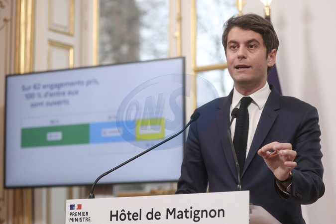 Le Premier ministre Gabriel Attal, accompagné de Bruno Le Maire et Marc Fesneau, donne une conference de presse sur la situation agricole, à l'Hôtel de Matignon à Paris